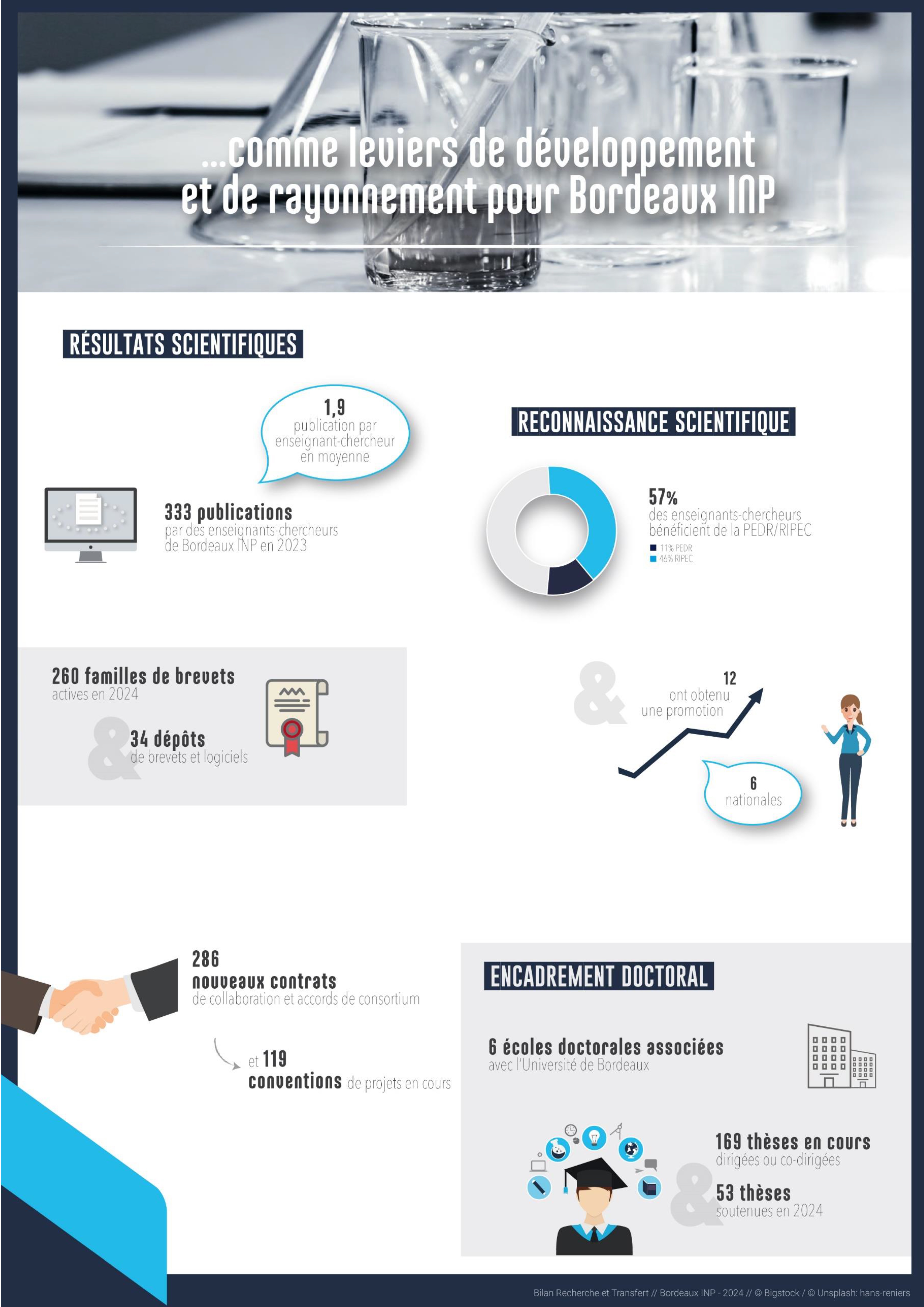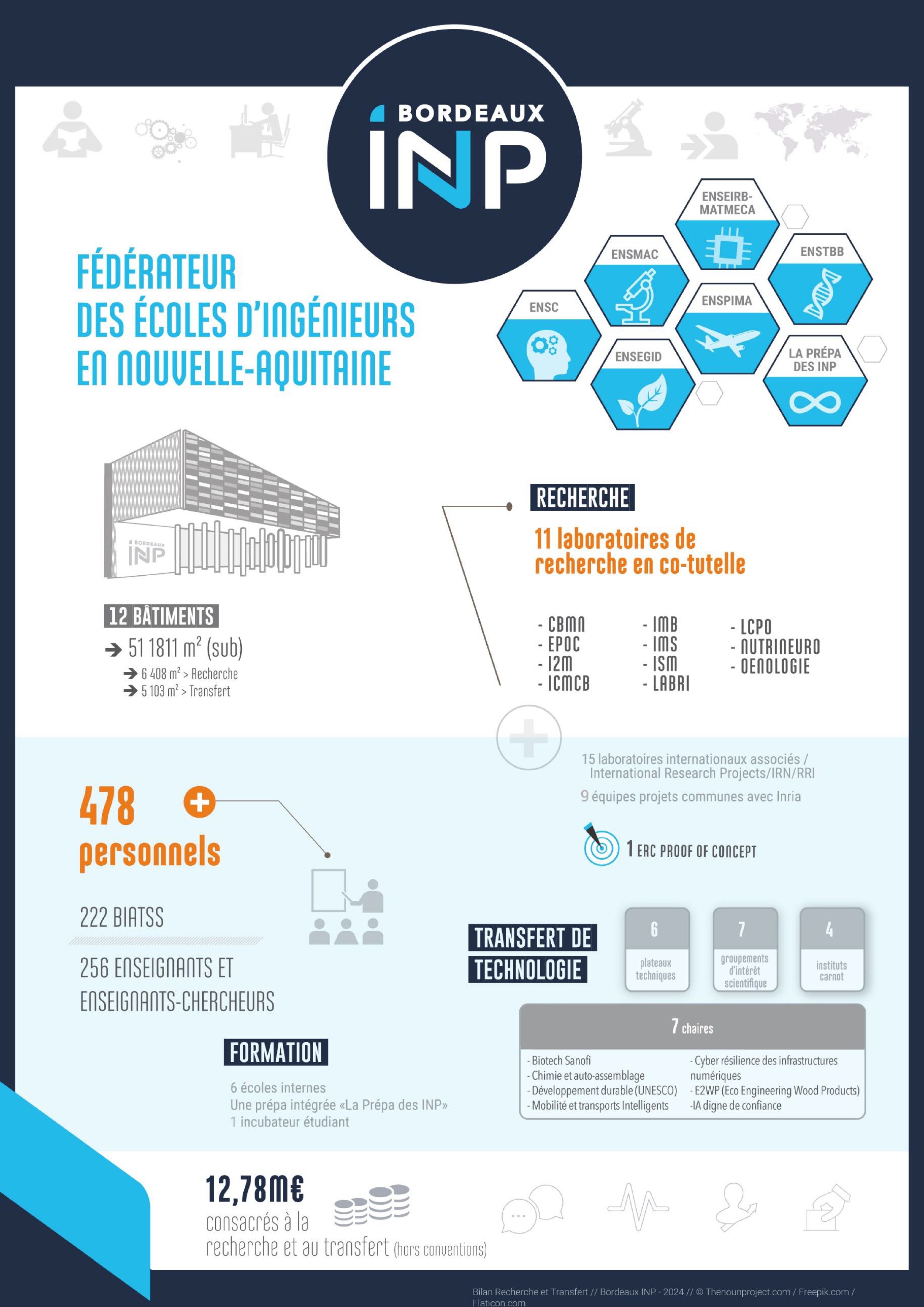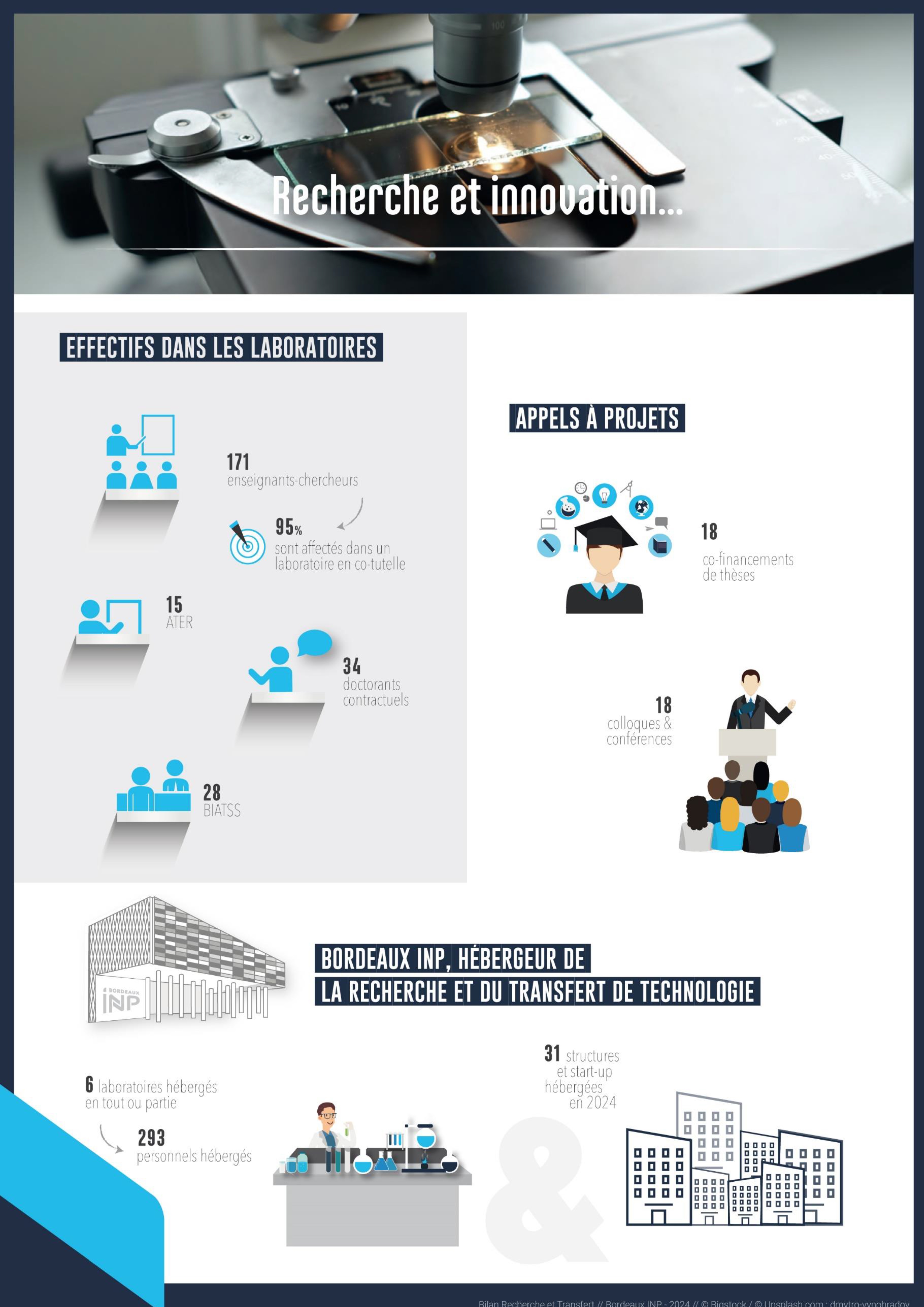Tous les ans, Bordeaux INP réalise son bilan Recherche et Tranfert. Ce dernier présente les activités de recherche et de transfert de technologie menées par Bordeaux INP et les laboratoires dont il est co-tutelle au cours de l’année écoulée. Chaque nouvelle édition permet de faire état de l’expertise scientifique et technologique de Bordeaux INP, positionnée sur des enjeux sociétaux majeurs et qui repose sur 11 laboratoires dans lesquels exercent 170 enseignants-chercheurs, mais également sur des structures communes et partagées avec les partenaires académiques et scientifiques de l'établissement.