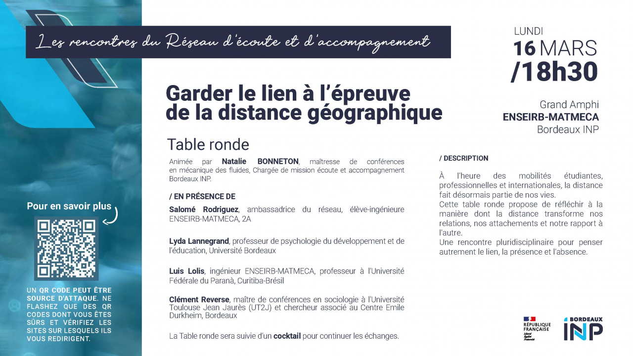 Animée par Natalie BONNETON, maîtresse de conférences en mécanique des fluides, Chargée de mission écoute et accompagnement Bordeaux INP.